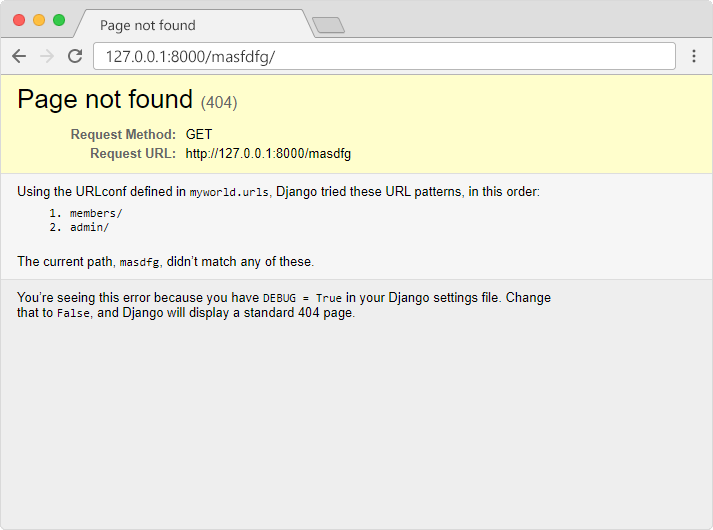 You will learn how to customize this 404 view later in this chapter, but first, just try to request a page that does not exist.