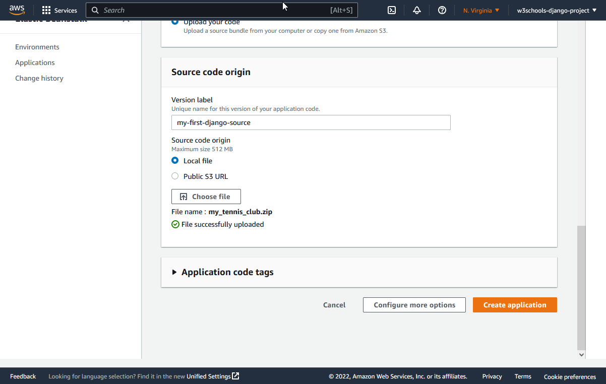 Next, scroll down to the next section, the "Application code" section, and choose "Upload your code".