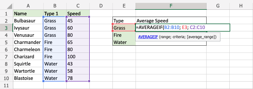 The function now calculates the average speed value of the Grass type Pokemon: Bulbasaur, Ivysaur and Venusaur.