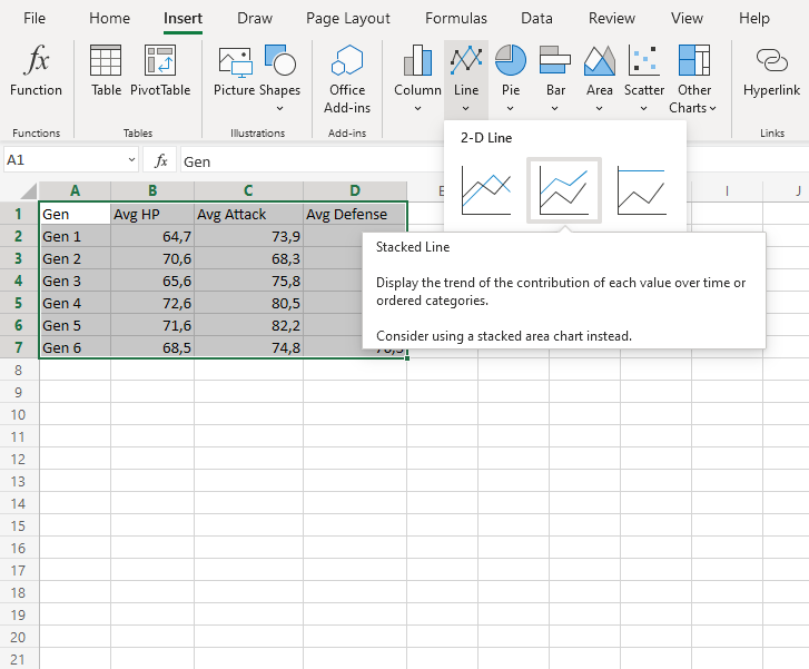 1. Click on the Insert menu, then click on the Line menu () and choose Stacked Line () from the drop-down menu