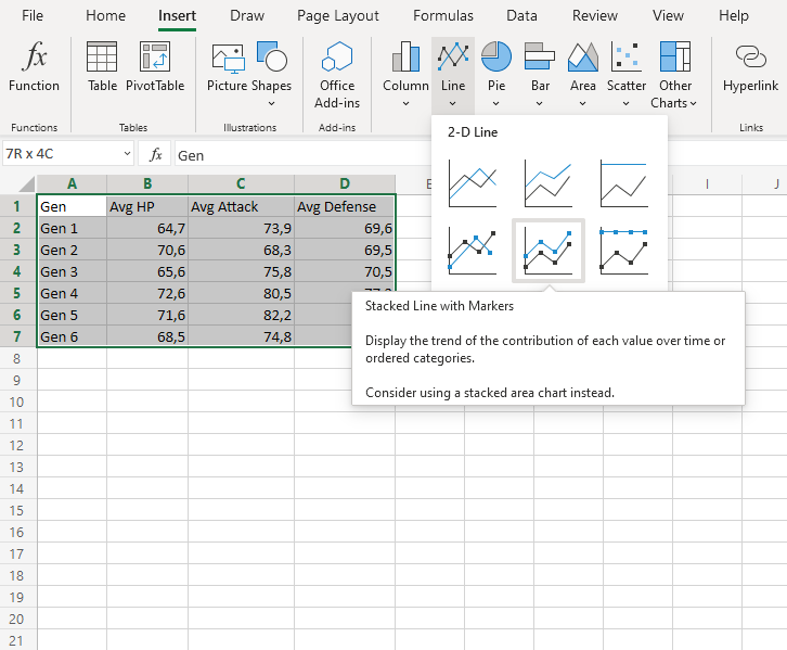 1. Click on the Insert menu, then click on the Line menu () and choose Stacked Line with Markers () from the drop-down menu