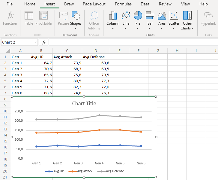 The chart gives a visual overview for the average Pokemon stats over generations.
