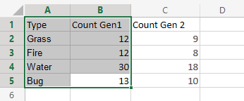 The chart gives a visual overview of the number of 1st generation Grass, Fire, Water and Bug type Pokemon.