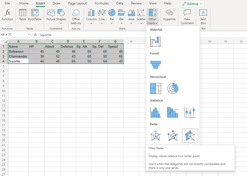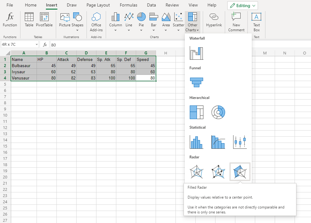 Caution: It's better to avoid using filled radar charts with multiple data columns because some data columns can overshadow others.