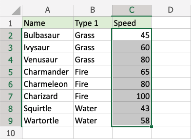 Here, the Speed values of each pokemon is formatted with a Color Scale: