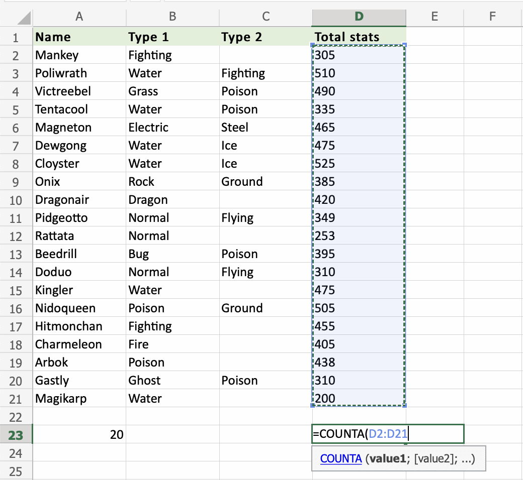 Apply the =COUNTA function to range A2:A21, counting Pokemons by their names, which are letters only: