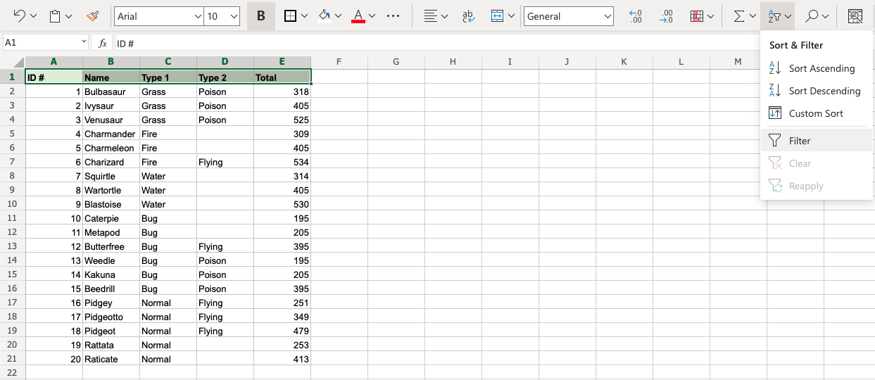 That is on point! We have sorted the range based on Type 1, Bug and Type 2, Poison. The filter option is helpful to make ranges easier to analyse.