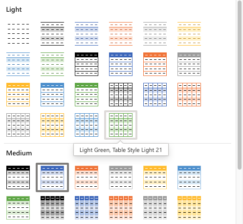 Note: Get familiar with the Table Styles. Try different options to see how they look.