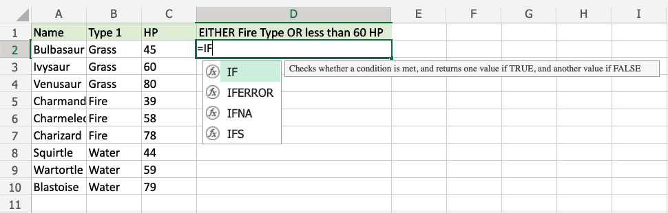 Now, each row has a check for Fire Type or HP less than 60, but not both:
