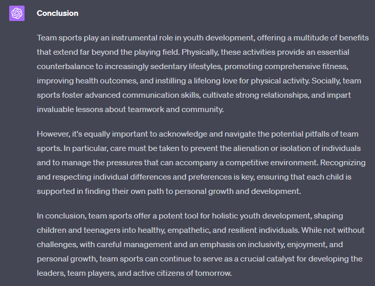 In our example, we will use the text 'For an article about "The importance of team sports for youth development", write a section about xyz' as a starting point: