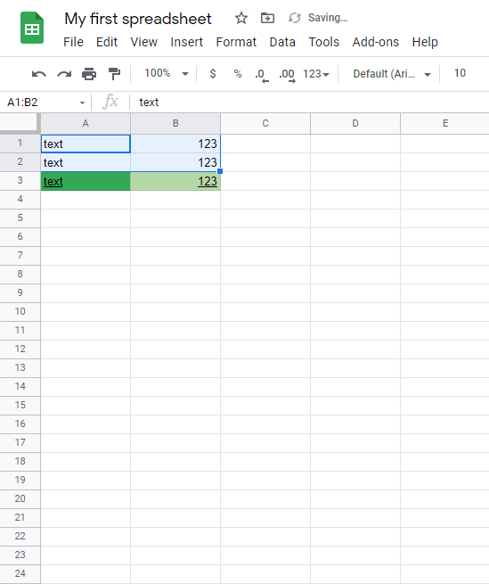 1. Select cells A2, B1 and B3 by holding the Ctrl button (Command for Mac) on the keyboard