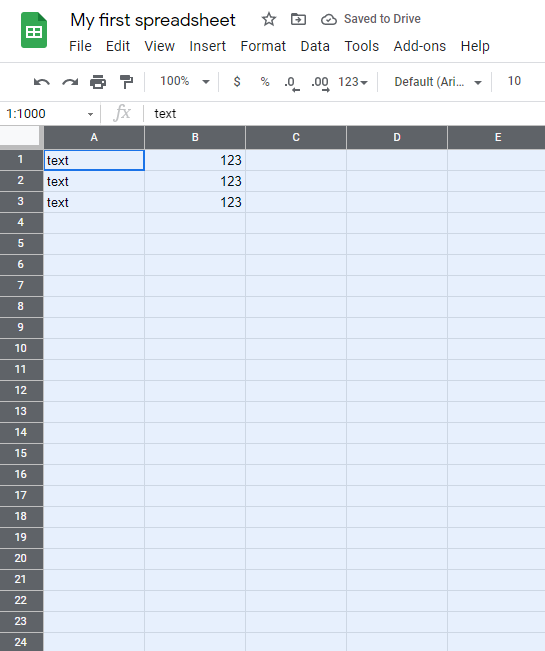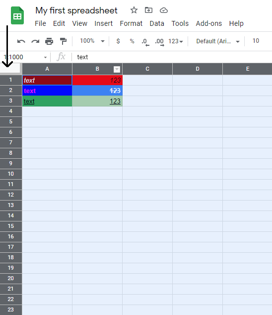 1. Select the entire spreadsheet by clicking on the rectangle on the top left corner of the sheet ()
