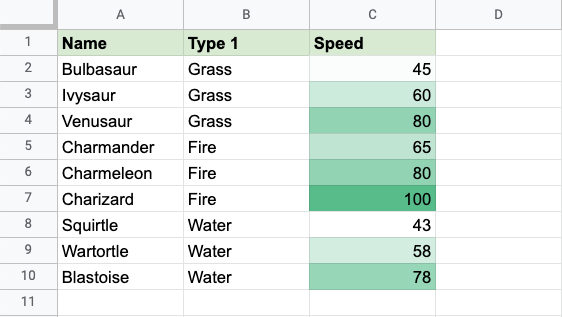 Here, the Speed values of each pokemon is formatted with a Color Scale: