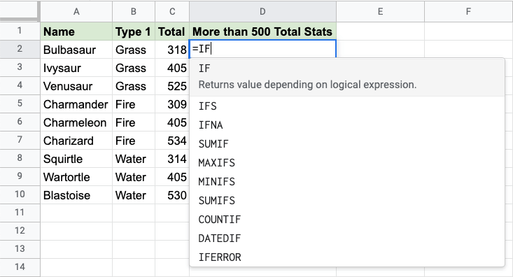 The IF function is a premade function in Google Sheets, which returns values based on a true or false condition.