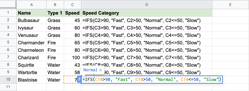 Since the value in cell C2 is "45", the first and second conditions are false, and third condition is true (less than or equal to 50), the function will return "Slow".