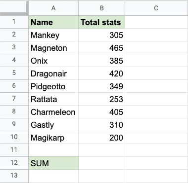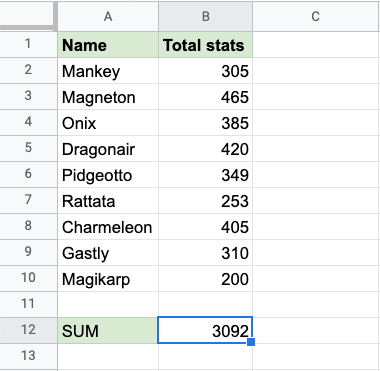 Great job! You have successfully calculated the sum of the stats using the =SUM function. The Pokemon's stats have a total sum of 3092.