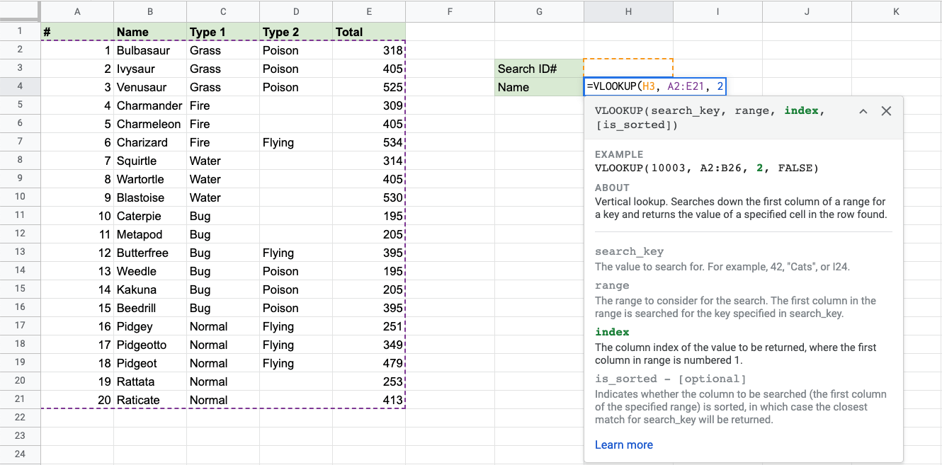Let's switch the labels, and try to enter Caterpie into the cell H3, where the vlookup functions finds the search_key: