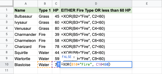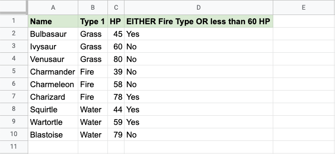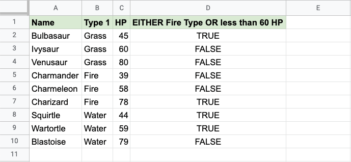 Now, each row has a check for Fire Type or HP less than 60, but not both: