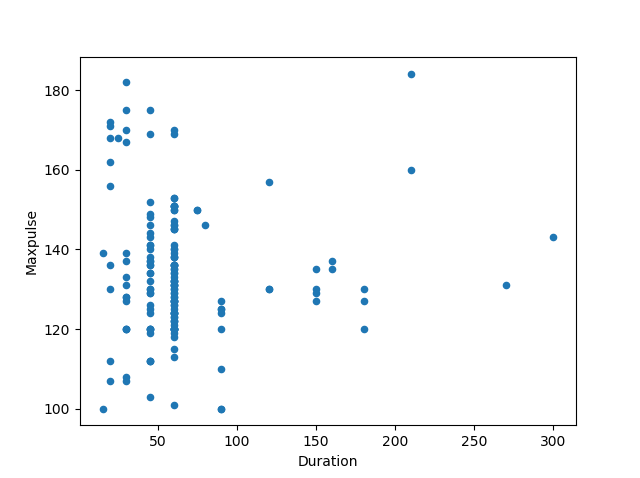 Let's create another scatterplot, where there is a bad relationship between the columns, like "Duration" and "Maxpulse", with the correlation 0.009403: