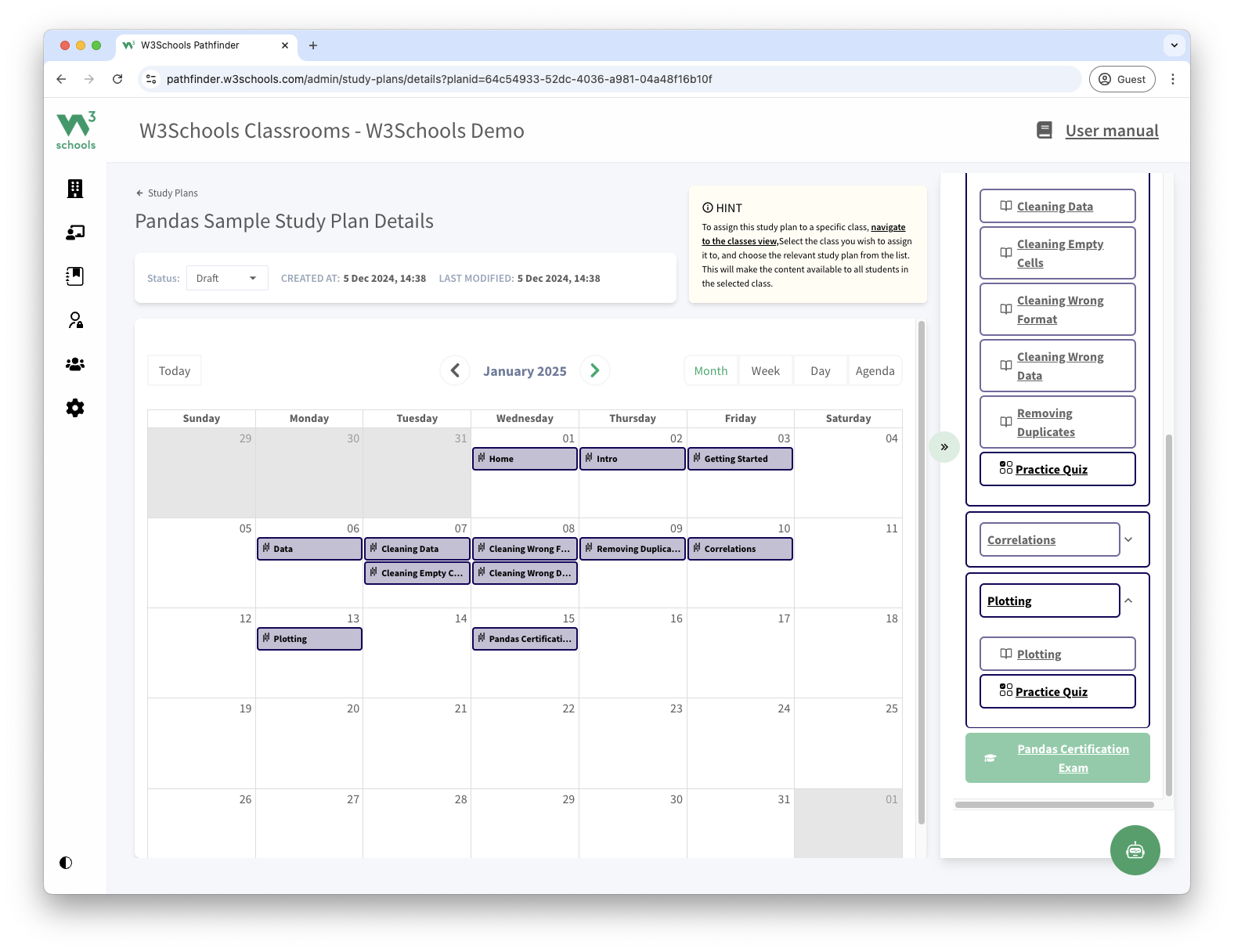 This study plan is a feature of W3Schools Academy.