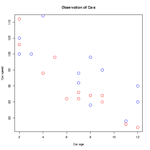 main="Observation of Cars", xlab="Car age", ylab="Car speed", col="red",